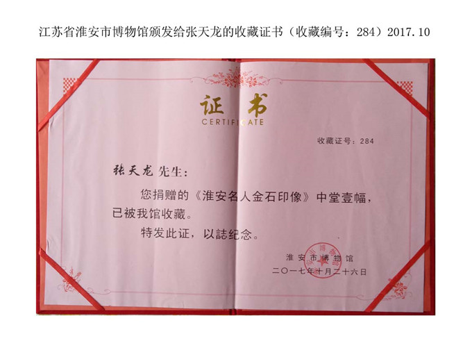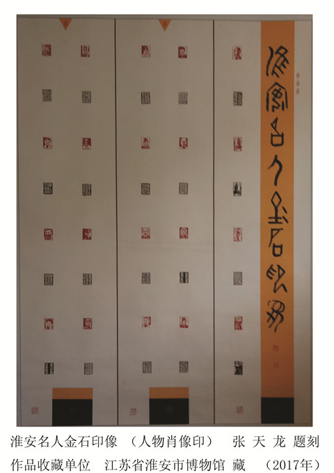 我会著名画家、篆刻家张天龙先生四十年如一日,刻苦专研书画、篆刻艺术,尤其擅长篆刻人物肖像印。他被篆刻(肖像印)界赞誉为:"张天龙是继承和发扬中国肖像印贡献者之一"。目前,他是江苏省书画篆刻界三位中国肖像印研究会会员之一,同时也是淮安市民建、江苏省民建界别中唯独一位国家级会员。品读他创作的肖像印:"中外名人,神形兼备,姿态神情,伟岸大象;气势情趣,独具新意,造像刀法,风格出众。"他的人物肖像印作品得到篆刻界专家学者的一致认可和赞誉。张天龙今年创作的篆刻(刻石)中国人物肖像印【淮安名人金石印像】在"大美民间"工艺美术精品展中被收藏专家选中,定为馆藏作品,被淮安市博物馆永久收藏。