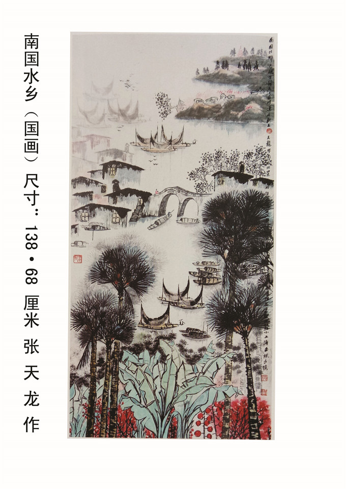 淮安市民建会员,书画篆刻家张天龙先生创作的国画作品《南国水乡》在书画展上展出。这次参展作品选自全省各市,共展岀258幅,参展作品主题鲜明,形式多样,笔墨生动,神采飞扬。此展是在党的十九大胜利召开之时举行的,是全省老年书画家向十九大献上的一份厚礼。