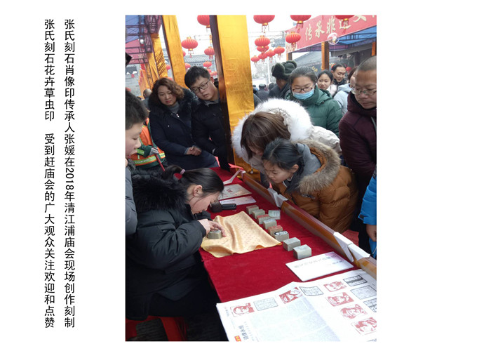 淮安市民建会员、画家、中国肖像印篆刻家张天龙先生应主办方邀请,继2017年,今年再次参加2018清江浦庙会,张天龙携传承人张媛女士现场创作篆刻肖像印,现场演示"张氏刻石花卉印"手工技艺,他们向广大赶庙会的群众奉献了一道民间绝技盛宴。