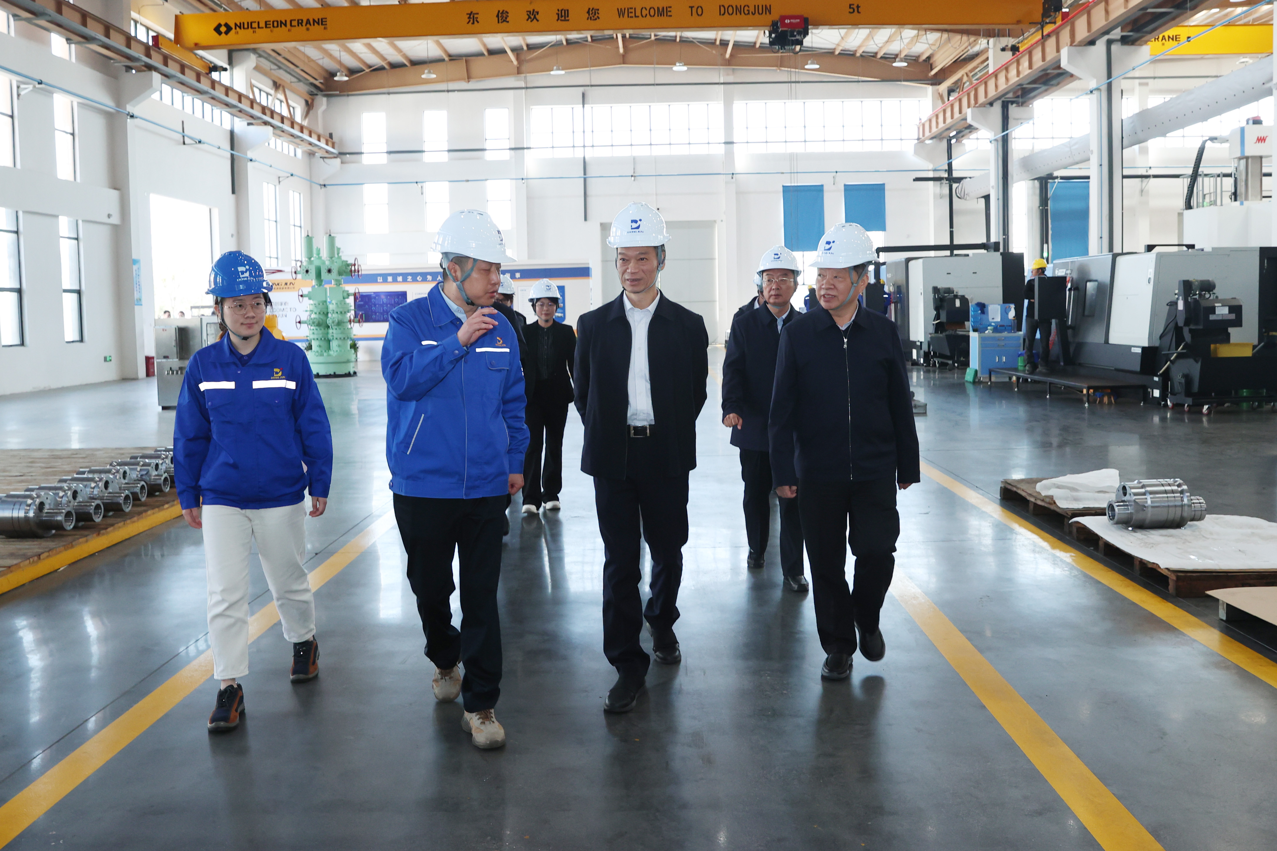 在民建会员企业洪泽东俊机械有限公司,洪慧民参观了企业的生产车间,实地察看智能化生产线运行情况,与企业董事长、民建会员杨俊亲切交流,详细了解了企业生产经营状况、科研成果转化、未来发展规划等情况。东俊机械专注于陆地、海洋油田钻采专用设备生产,是中海油、中石化、中石油等供应单位,60%的产品销往国外,被美国石油协会授予API-6A、API-16C证书。洪慧民对企业以创新驱动为核心所取得的成绩给予肯定,强调企业应始终秉持创新驱动发展的战略定力,深挖内生发展动力,持续锻造行业领先的核心竞争力,在服务地方经济转型升级中彰显民建企业的使命担当,书写新时代民营经济创新发展的精彩篇章。