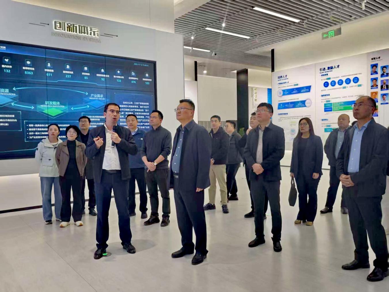 韩文军一行首先抵达江苏省产业技术研究院总部展厅。在讲解员的引导下,考察团详细了解了“拨投结合”机制的技术转化案例、孵化企业成果及创投基金运作模式。韩文军指出,产研院在推动科技成果转化中的枢纽作用,为民建企业家会员对接高端科创资源提供了重要窗口,要充分发挥民建密切联系经济界的特色优势,推动更多会员企业融入长三角科技创新生态。